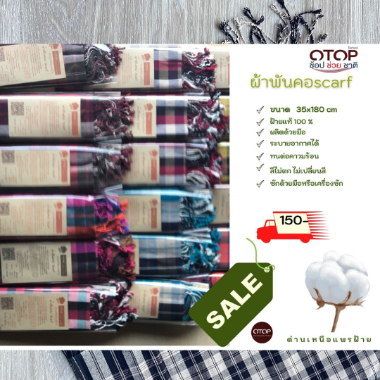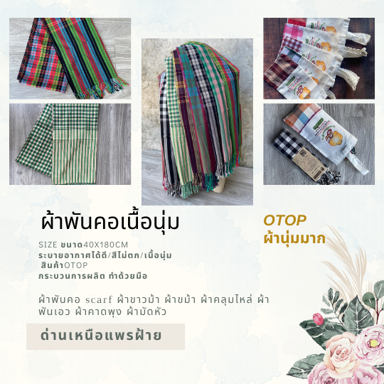 สินค้า OTOP ขนาด 40x180 cm ผ้าฝ้าย 90 % เรยอน 10 % กระบวนการผลิต ทำด้วยมือ ใช้สีสังเคราะห์ในการย้อมเส้นใย วิธีใช้ -ใช้เป็นของสมนาคุณ หรือของฝากก็เหมาะมากๆ -ใช้เป็นของฝาก ของที่ระลึกได้ -ใช้พันศรีษะ โพกศรีษะ -ใช้พันคอ ผูกเอวต้อนรับ -ใช้เป็นของชำร่วย งานแต่ง หรืองานต่างได้ ฯลฯ วิธีการดูแลรักษา ซักในน้ำสะอาด ไม่ควรใช้สารฟอกขาว ตากในที่รม ลมโกรก "ผลิตภัณฑ์พื้นบ้าน สืบสานภูมิปัญญา พัฒนาเศรษฐกิจ ชุมชน " ผ้าพันคอฝ้ายมีคุณสมบัติที่ดีต่อผิว เนื่องจากมีลักษณะที่ละเอียดอ่อนและไม่มีเส้นใยที่แข็งกระด้าง ทำให้เหมาะสำหรับผู้ที่มีผิวแพ้ง่าย และมีความสามารถในการดูแลผ้าได้ง่าย นอกจากนี้ ผ้าฝ้ายยังมีลักษณะการกันเปื้อนที่ดี และสามารถซับน้ำได้ดี ทำให้เหมาะสำหรับใช้เป็นผ้าเช็ดหน้าและผ้าเช็ดตัว อีกทั้งยังเป็นผ้าที่มีความเป็นธรรมชาติ สวยงาม และเป็นสัญลักษณ์ของวัฒนธรรมไทยอีกด้วยครับ. ![]() ![]() ![]() ![]() ![]() ![]() ![]() ![]() ![]() ![]() |